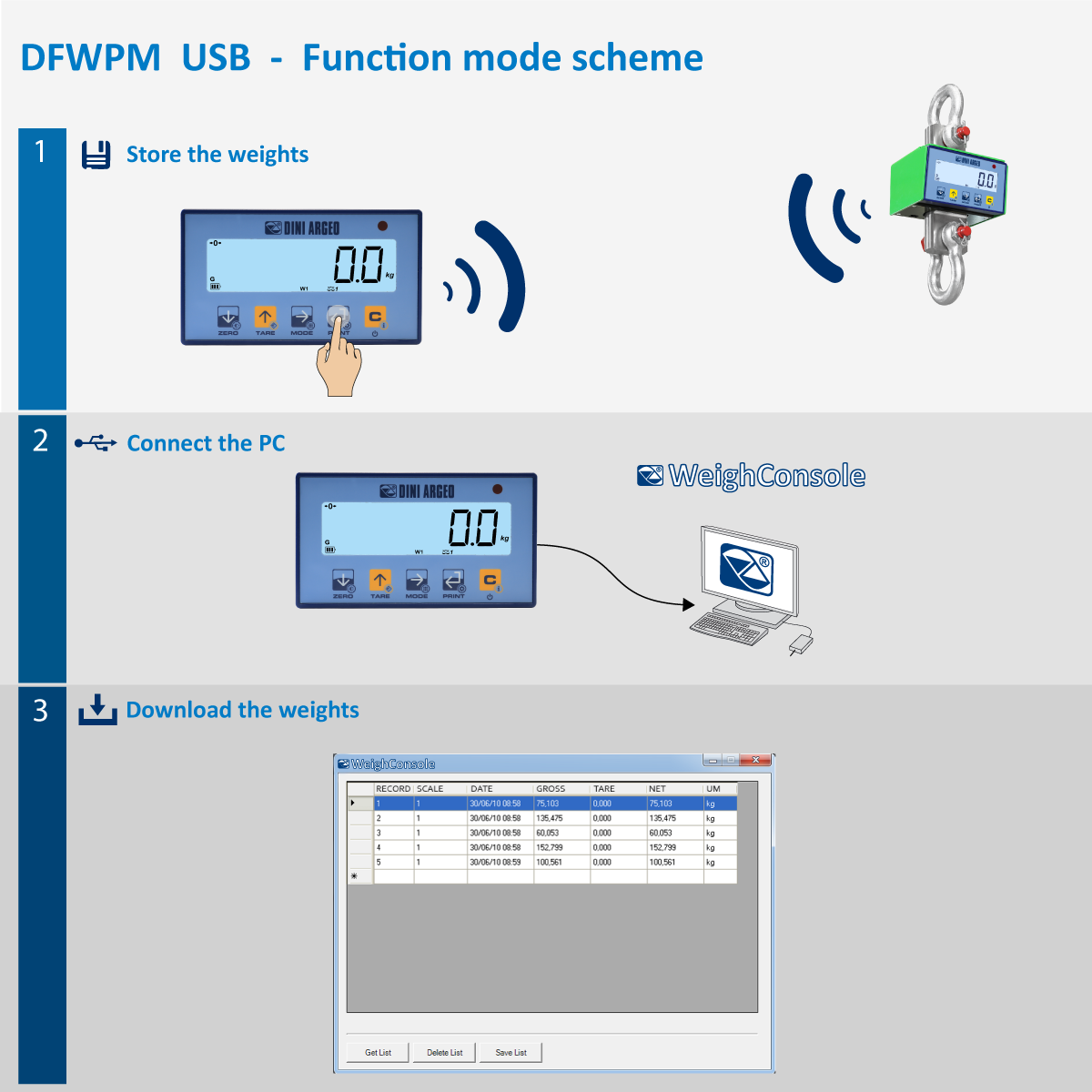 Funktion, die es ermöglicht alle Hauptfunktionen der verbundenen Waage zu steuern; in anderen Worten: ZERO, TARA, DRUCKEN, AKTIVIEREN/DEAKTIVIEREN des FUNKTIONSMODUS und AUSSCHALTEN.